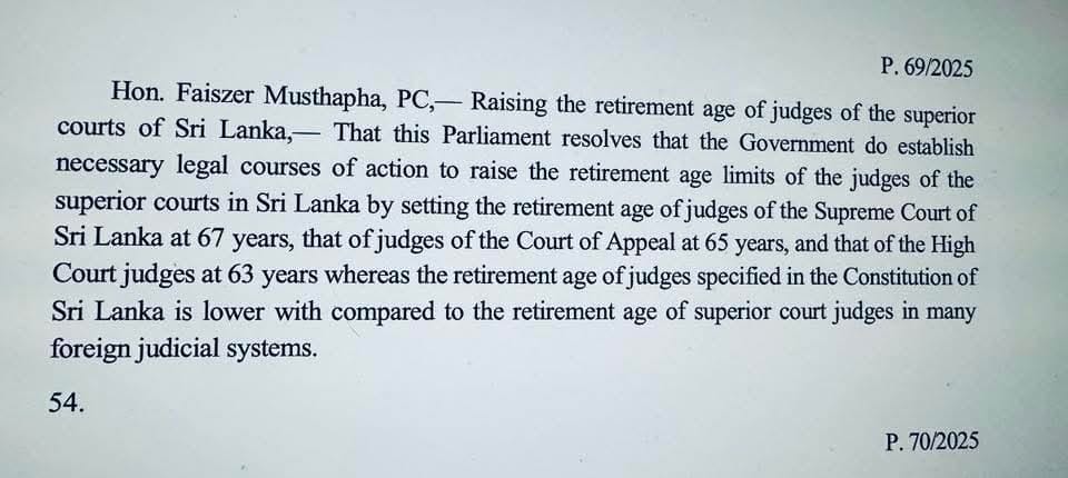 පාර්ලිමේන්තු මන්ත්රී පෆිසර් මුස්තාපා හමුවී ජනාධිපතිවරයාගේ විශේෂ පනිවිඩයක් දැනුම් දී ඇත. එනම් ලබන වසරේදී වයස අවුරුදු 65 සැපිරීම නිසා විශ්රාම යාමට නියමිත වත්මන් අග්රවිනිශ්චයකාර ප්රිති පද්මන් සූරසේන මහතාගේ සේවා කාළය තවත් අවුරුදු 5 ක් ඉදිරියට දීර්ඝ කරන ලෙසට පුද්ගලික යෝජනාවක් පාර්ලිමේන්තුවට ඉදිරිපත් කරන ලෙසයි. එනම් අග්රවිනිශ්චයකාර වරයා විශ්රාම ගැන්වීම අවුරුදු 70 ක් දක්වා ඉහල දැමීමටය.
