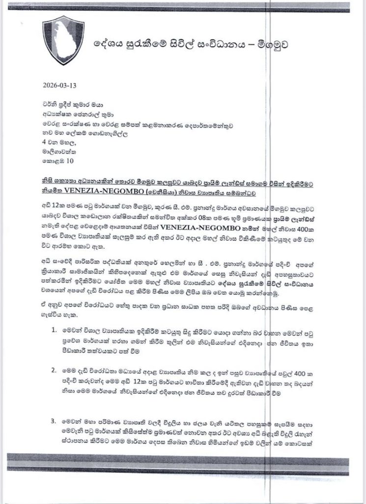 VENEZIA – NEGOMBO නිවාස ව්යාපෘතියට අනුමැතිය ලබා ගැනීමේ ගැටලු ඇති බව දැනගත් පාරිභෝගිකයන් පිරිසක් ඔවුන්ගේ මුදල් නැවත ඉල්ලාගෙන ඇති බවද වාර්තා වේ.මේ අතර, මේ ව්යාපෘතිය අනුමත කිරීමට නම් අවම වශයෙන් අඩි 30ක හෝ පිවිසුම් මාර්ගයක් අදාළ ඉඩමට තිබිය යුතු බැවින් ප්රදේශවාසීන්ගෙන් එම ඉඩමට සමස්ත ලෙස ඇති අඩි 8ක පමණ මාර්ගය විශාල කර ගැනීමට එහි බලධාරීන් විශාල වෙහෙසක් දරමින් සිටින බවද පැවසේ.